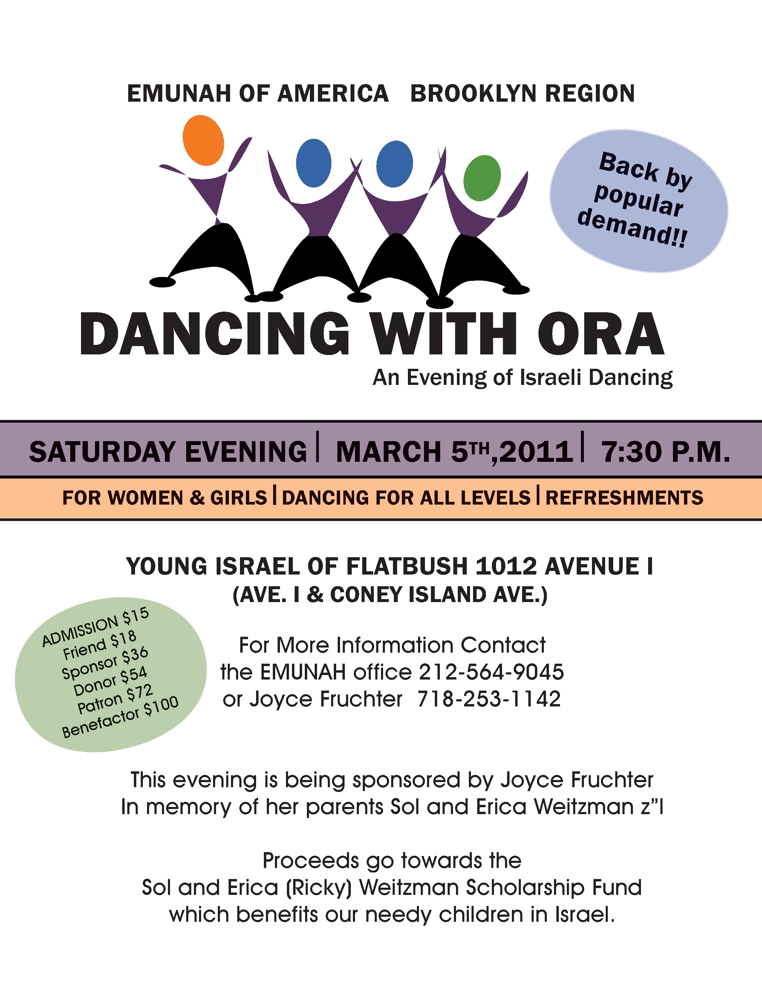 Emunah of America Brooklyn Region Saturday Evening March 5th, 2011 7:30 pm. For Women & Girls – Dancing for all levels – Refreshments