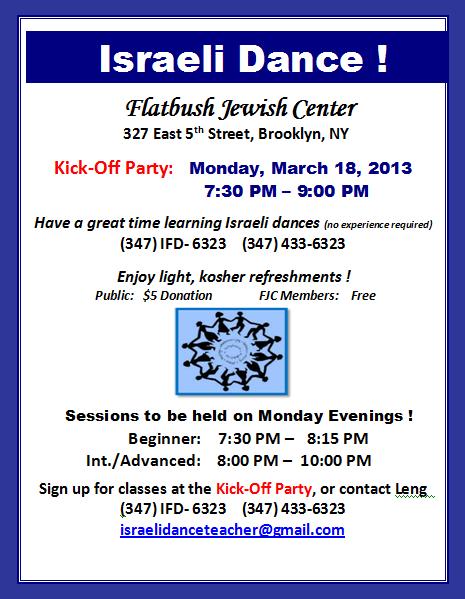 If you want to learn Israeli Dance in Brooklyn, here is an opportunity to do so in a fun, warm inviting setting. Join us for a kick-off Israeli dance party, for men & women – on Monday, March 18 at 7:30 PM for only $5. The class is located at the Flatbush Jewish Center, and easily accessible from South Brooklyn. At this party you will have the opportunity sign up for future classes!