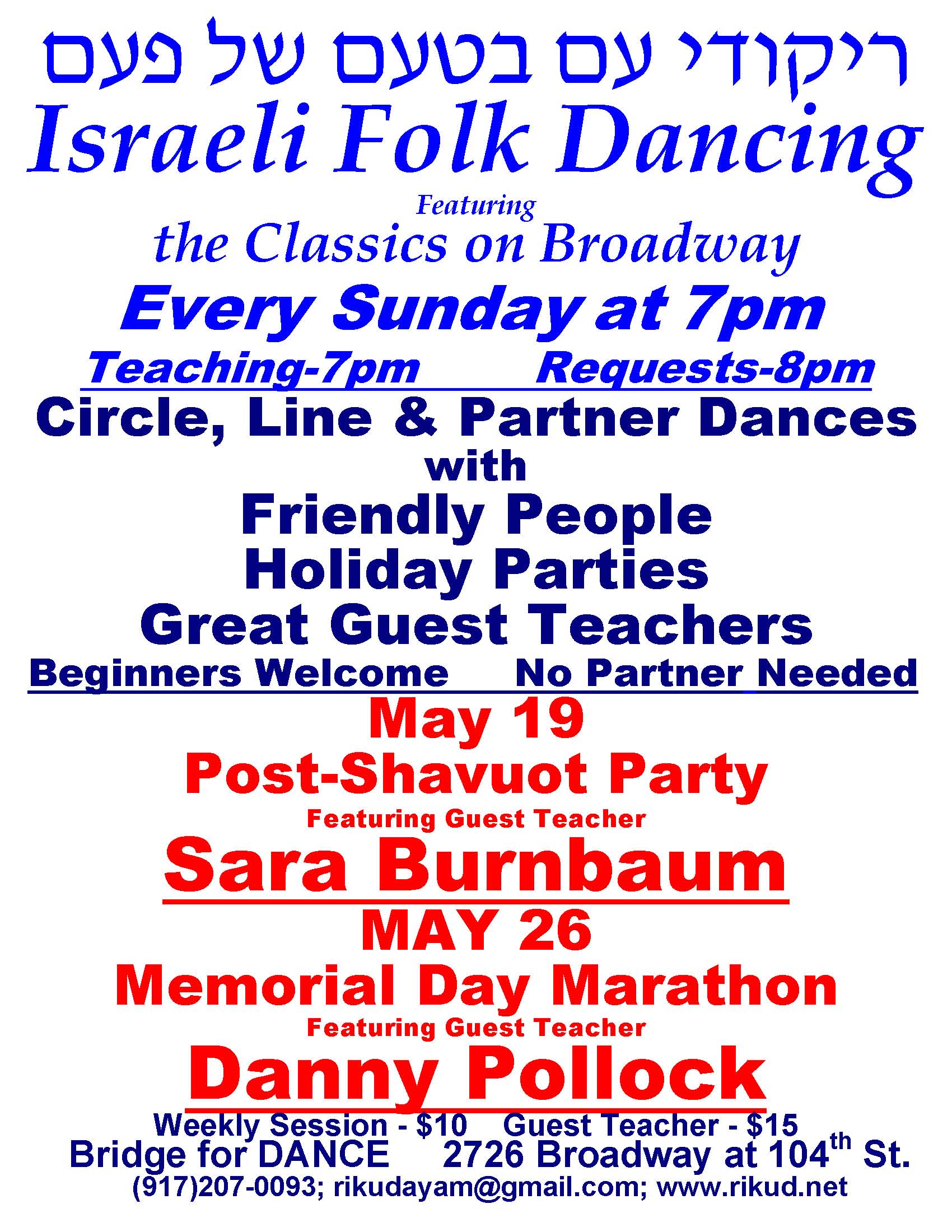 All are Invited to a Post-Shavuot Party Featuring Guest Teacher SARA BURNBAUM on May 19 & an All-Request MARATHON of Classic Israeli Folk Dances with DANNY POLLOCK on May 26.